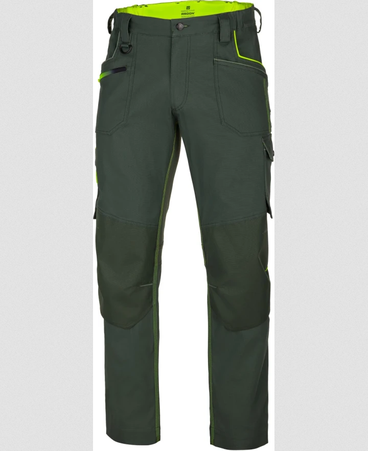 Strečové bavlněné montérkové kalhoty do pasu ze speciálního materiálu Amalytton®, který vyniká zvýšenou pevnostía hladkým, jemným povrchem. Sníženou gramáž oceníte díky příjemnému pocitu při nošení. Na exponovaných partiích je použitý odolný a čtyřsměrně elastický materiál Tabiflex®. Kalhoty mají vysoce funkční ergonomický 3D střih SLIM FIT, který zvýrazňuje siluetu. Oblast kolen je zesílená odolným materiálem Oxford s vodoodpudivou úpravou, kapsa na nákoleníky umožňuje použití výztuhy. Kalhoty jsou vybaveny pružným pasovým límcem spolu se skrytým zadním dvojitým poutkem pro pohodlné usazení opasku, vnitřní protiskluzovou páskou, D kroužkem na karabinu, 2 průhmatovými kapsami,1 přední zipovou kapsou, 1 přední nářaďovou kapsou se širokým poutkem, na pravé nohavici je umístěna multifunkční kapsa na skládací metr, šroubovák a odlamovací nůž se širokými poutky, na levé nohavici je velká dvojitá kapsa krytá patkou na druk, trojité prošití v namáhaných partiích. Zadní díl člení sedlo a 2 kapsy, pravá zadní kapsa je krytá patkou na druk. Spodní lem nohavic je vyztužený materiálem Oxford, který je odolný proti oděru. Zvýšenou viditelnost uživatele zajišťují dynamické reflexní 3D potisky a hi-vis doplňky. Délku nohavic lze snadno prodloužit o 5 cm.