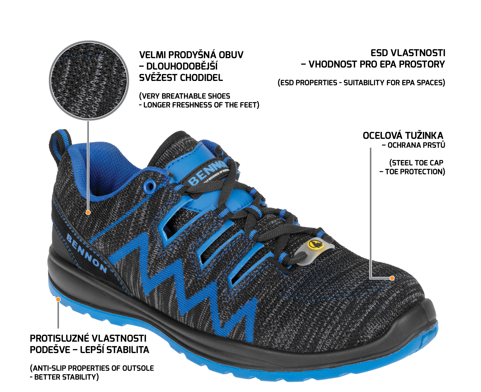 Díky svým ESD vlastnostem lze obuv doporučit do EPA provozů, dále do vnitřních prostor a suchého venkovního prostředí.