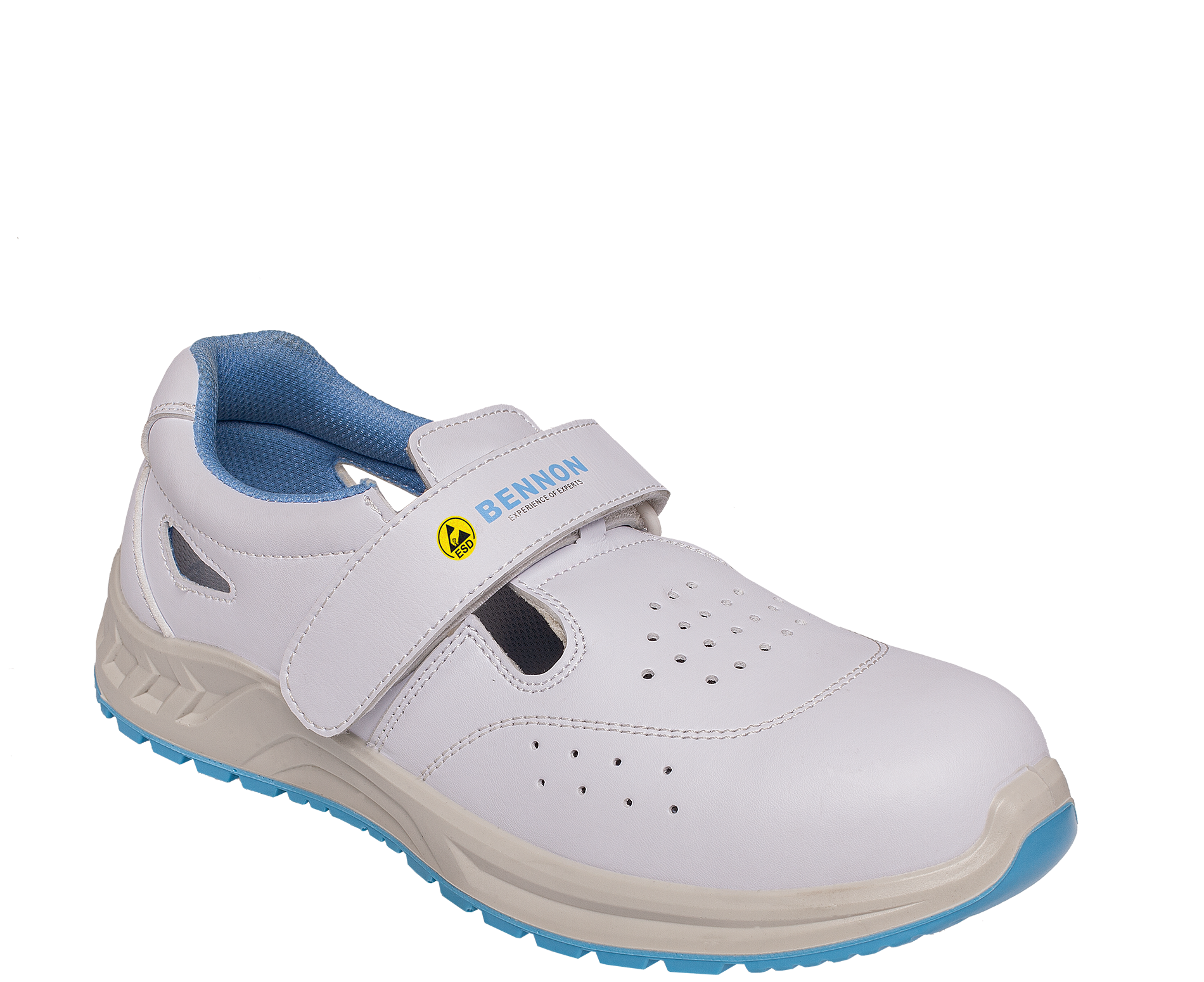 Bílá, dobře omyvatelná, antistatická obuv s ESD vlastnostmi.