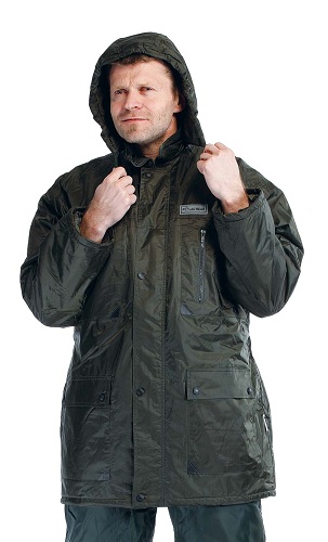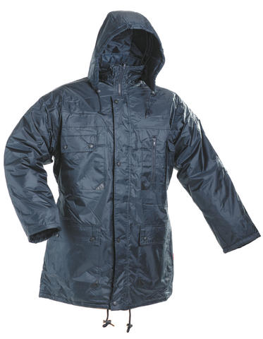 Bunda s kapucí, polyester/PVC. Ochrana proti bežným klimatickým vlivům.