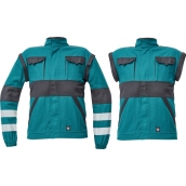 Pánská pracovní bunda se zapínáním na zip krytým légou; odepínatelné rukávy; 2 přední kapsy, 2 náprsní kapsy; zesílení namáhaných míst loktů a ramen; reflexní pruhy po odvodu rukávů a ve spodní části zad; pružné manžety rukávů a spodní obvod v pase.