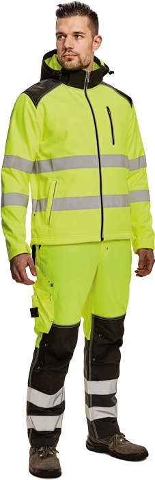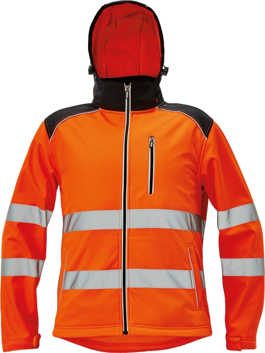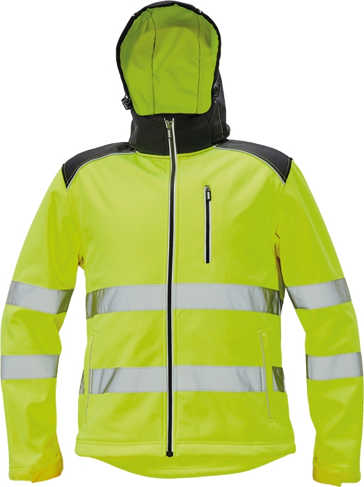 Pánská sofsthellová bunda s odnímatelnou kapucí, s TPU membránou zajišťující voděodolnost a paropropustnost v hi-vis barevném provedení; zesílená oblast ramen a loktů; 1 náprsní kapsa na zip; 2 postranní lištové kapsy; 2 uzavíratelné vnitřní kapsy; reflexní paspulka lemující sedlo a boční kapsy; nastavitelná šíře spodního obvodu a rukávů