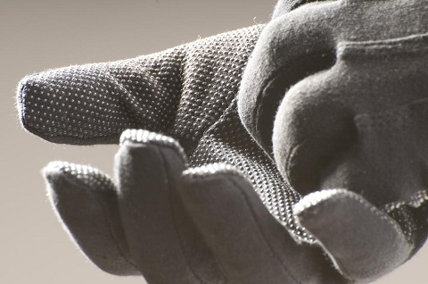 Rukavice šité z bavlněného úpletu, s PVC terčíky v dlani a na prstech, pružinkou na horní části zápěstí, bez manžety.