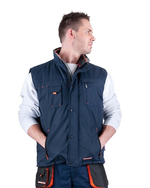 Zateplená nepromokavá vesta (přizpůsobená strojnímu vyšívání) s podšívkou a se zipem, stahovací šňůrka v pase. Vhodné pro potisk a výšivku.