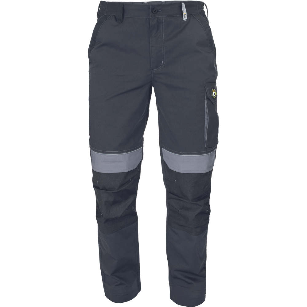• pánské pracovní kalhoty s elastickým pasem • 2 přední kapsy • 1 levá stehenní kapsa • 2 zadní kapsy se zapínáním na suchý zip • zesílená oblast kolen s možností vložení chráničů kolen • reflexní prvky • nastavitelná délka nohavic