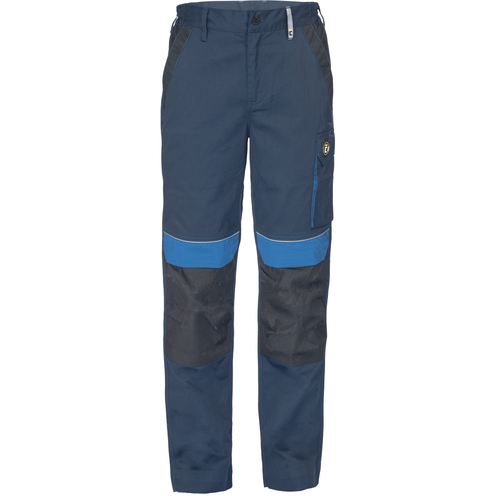 • pánské pracovní kalhoty s elastickým pasem • 2 přední kapsy • 1 levá stehenní kapsa • 2 zadní kapsy se zapínáním na suchý zip • zesílená oblast kolen s možností vložení chráničů kolen • reflexní prvky • nastavitelná délka nohavic