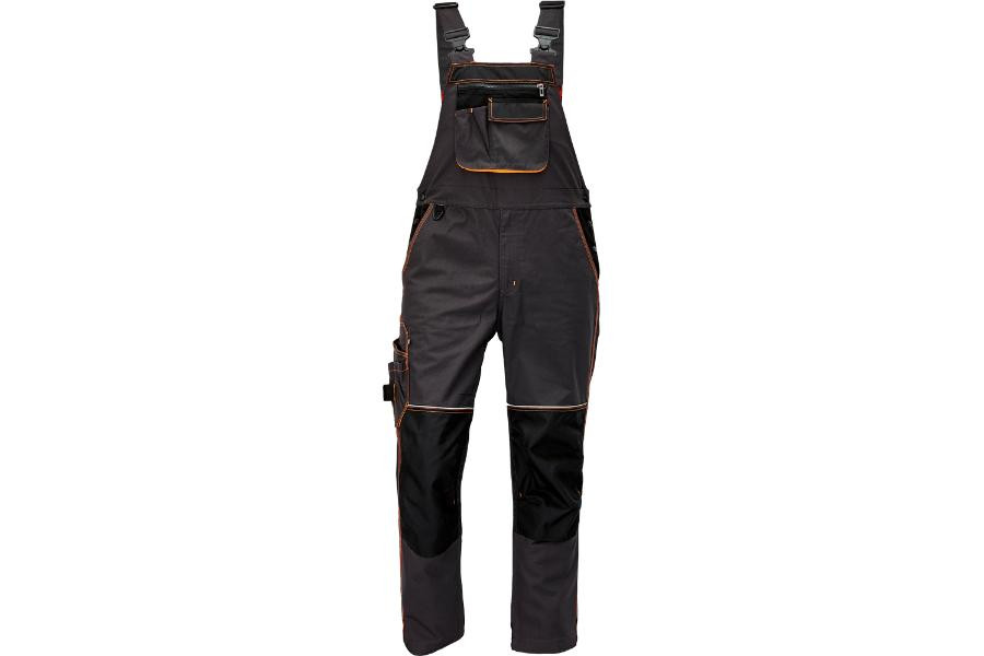 Pánské pracovní kalhoty s laclem • elastické šle a pas • 2 hluboké postranní kapsy • 1 multifunkční kapsa na straně nohavice • 1 nakládaná multifunkční náprsní kapsa na laclu • D koužek pro přichycení identifikační karty • 2 nakládané zadní kapsy s patkou • zesílená oblast kolen s možností vkládání kolenních výztuh • záložka na nohavici umožňující prodloužení délky až o 5 cm • zesílená zadní strana spodku nohavice • dekorativní prošití a kontrastní prvky v hi-vis barvě