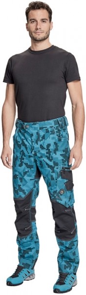 Pánské pracovní kalhoty, elastický inovativní materiál TRIFIBETEX® v přírodním maskování, slim střih, snížený pružný pas, odolné trojité prošití nohavic a sedu, CORDURA zesílená oblast kolen, prostorné multifunkční přední kapsy s poutky na nářadí, 2 zadní kapsy na suchý zip, stehenní kapsa na telefon s klopou a zapínáním na suchý zip, kapsa na metr a nůž, poutko na kladivo, "D" kroužek, poutko na nářadí v pase, originální zpracování zapínání kalhot, reflektivní prvky v barevném odstínu, nastavitelná délka nohavic.