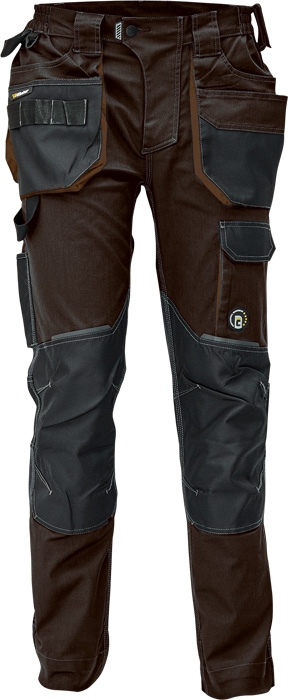 pánské pracovní kalhoty; elastický inovativní materiál TRIFIBETEX; ergonomický střih; snížený pružný pas; odolné trojité prošití nohavic a sedu; zesílená kapsa na nákoleníky z materiálu Oxford; prostorné multifunkční přední kapsy s poutky na nářadí; 2 zadní kapsy s klopou zesílené Oxfordem; stehenní kapsa na telefon s klopou a zapínáním na suchý zip; kapsa na metr a nůž; poutko na kladivo; "D" kroužek; poutko nanářadí v pase; originální zpracování zapínání kalhot; reflektivní prvky v barevném odstínu; nastavitelná délka nohavic