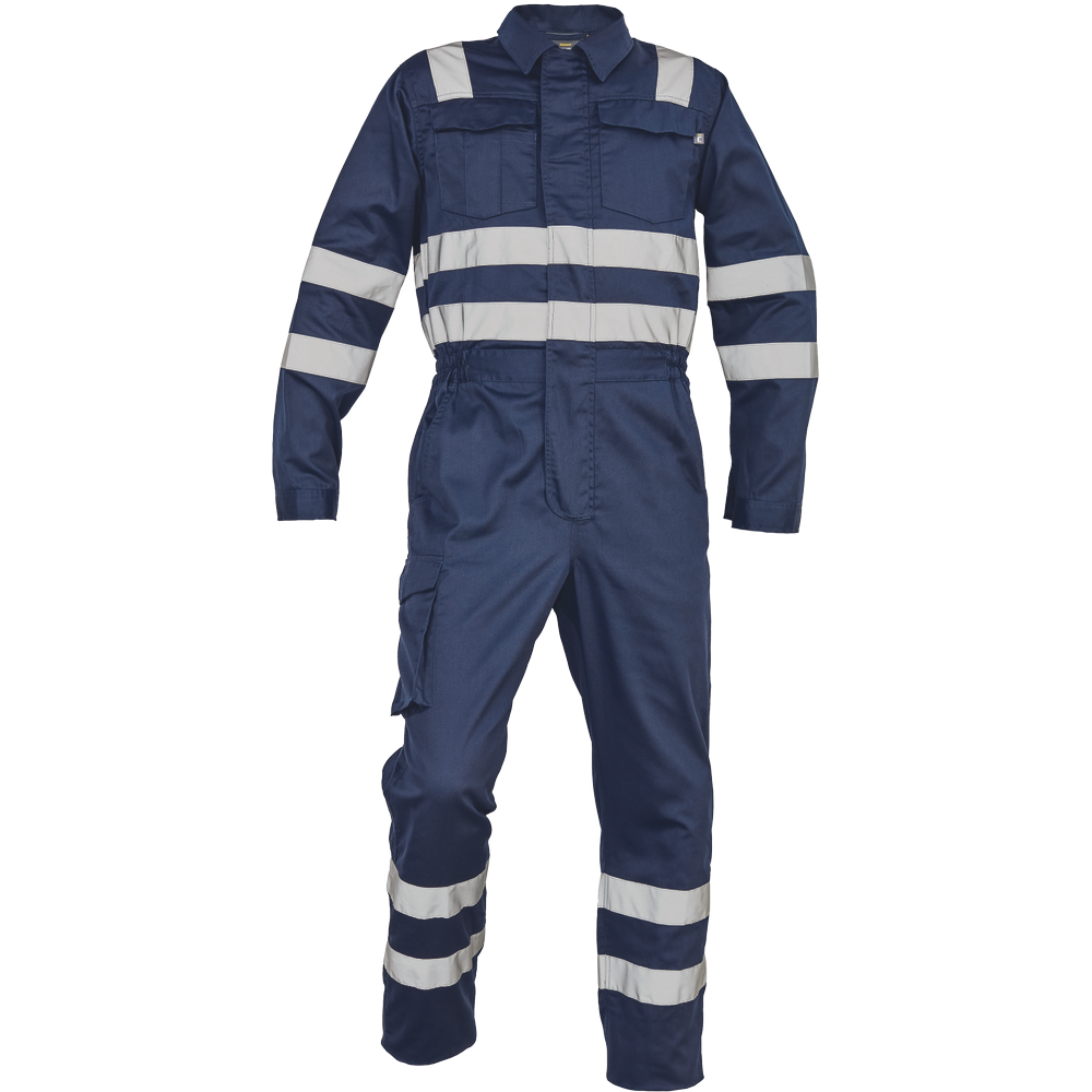 • pánský lehký pracovní overal s reflexním pruhy přes ramena, v bocích, na rukávech a nohavicích • elastický pas, zapínání na zip kryté légou na suchý zip • 2 postranní kapsy, 1 kapsička na mince • 1 multifunkční stehenní kapsa • 2 náprsní kapsy s klopou, 2 zadní kapsy • nastavitelná délka nohavic