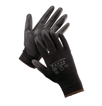 Pletené bezešvé polyesterové, rukavice s tenkou vrstvou polyuretanu v dlani a na prstech a pružnou manžetou.
