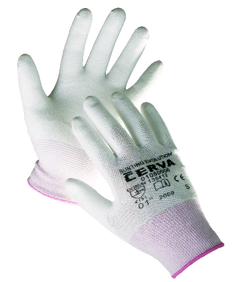 Pletené bezešvé polyesterové rukavice, s tenkou vrstvou polyuretanu v dlani a na prstech a pružnou manžetou. Bílé.