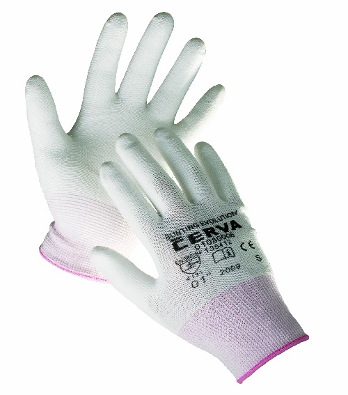Pletené bezešvé polyesterové rukavice, s tenkou vrstvou polyuretanu v dlani a na prstech a pružnou manžetou. Bílé.