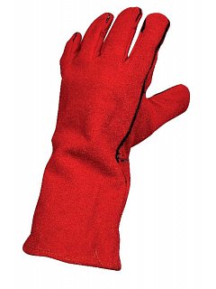Celokožené rukavice z hovězí štípenky v délce 35 cm, s bavlněnou podšívkou a krytými švy. Certifikát: svářečské práce - typ A
