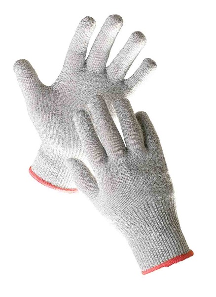 Pletené bezešvé rukavice z modifikovaného skleněného vlákna, Spandexu a nylonu, s odolností proti prořezu tř. 5.