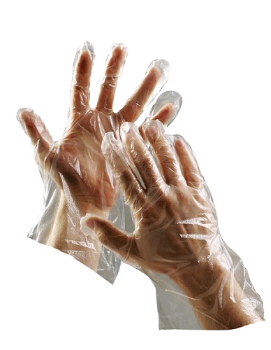 Jednorázové rukavice z polyetylénové fólie vhodné pro krátkodobý styk s potravinami.