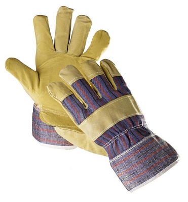 Rukavice z hovězí štípenky v dlani s podšívkou, hřbet a manžeta z bavlněné tkaniny.