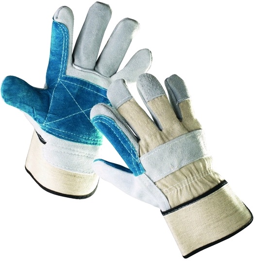 Rukavice z hovězí štípenky s podšívkou a zesílenou vrstvou v dlani, z bílou bavlněnou tkaninou na hřbetu a s tuhou manžetou. Barva zelená-šedá. Velikost 10,5.
