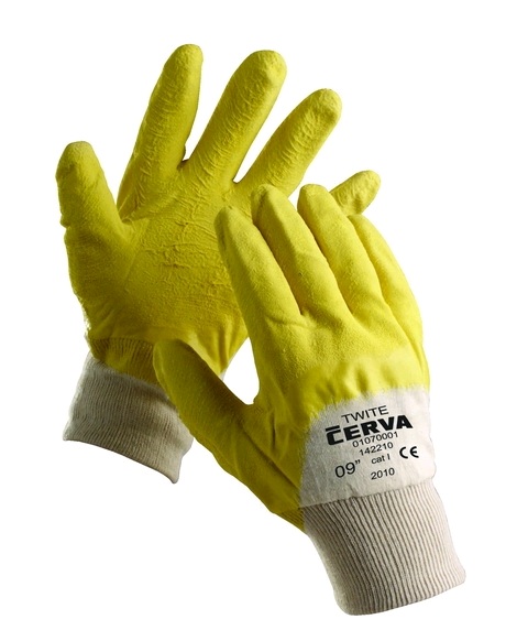 Šité bavlněné rukavice s pružným nápletem na zápěstí, polomáčené v přírodním latexu, protiskluzná úprava povrchu dlaně a prstů.