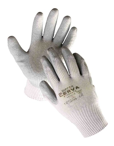 Pletené bezešvé rukavice ze směsi bavlna/polyester, polomáčené v přírodním latexu, s protiskluzovou úpravou v dlani a na prstech a pružným nápletem na zápěstí. Velikosti: dámské 8 (zelená), pánské 10 (šedá)