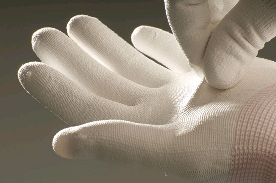 Pletené bezešvé nylonové rukavice s tenkou vrstvou polyuretanu v dlani a na prstech a pružnou manžetou.