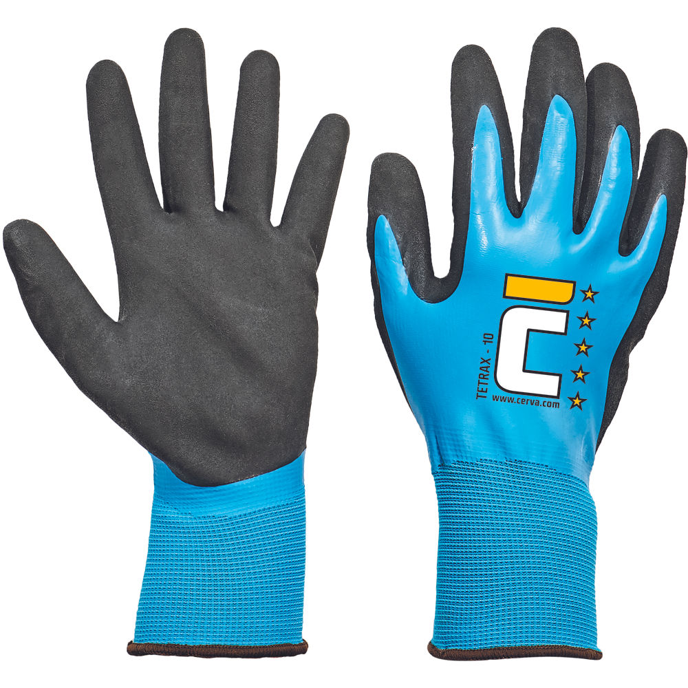 Pletené bezešvé nylonové rukavice, 2x máčené v latexu, protiskluzová úprava v dlani a na prstech, průžný náplet na zápěstí.