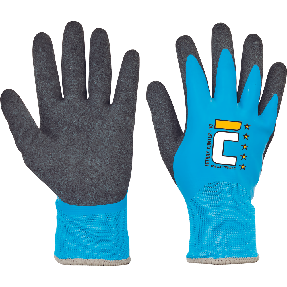 Zateplené pletené bezešvé nylonové rukavice, 2x máčené v latexu, protiskluzová úprava v dlani a na prstech, pružný náplet na zápěstí.