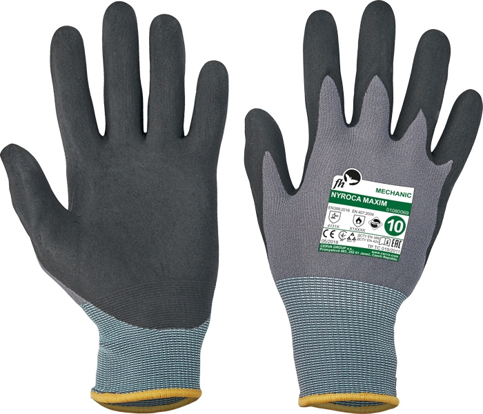 Rukavice z úpletu nylon/lycra máčené v mikroporézním nitrilu, excelentní prodyšnost, velmi dobrý úchop za mokra, v olejnatém prostředí i za sucha.