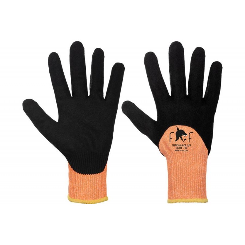 Pletené bezešvé rukavice s máčením v mikroporézním nitrilu v dlani s ochranou vůči řezu E, rukavice vhodné do suchých a vlhkých či olejnatých prostředí. Ideální pro manipulaci s ostrými a mastnými díly, manipulaci se sklem anebo opracování mastných kovů a plechů.