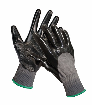 Pletené bezešvé ruklavice máčené do 3/4 v černém nitrilu na dlani a prstech, pružný náplet.