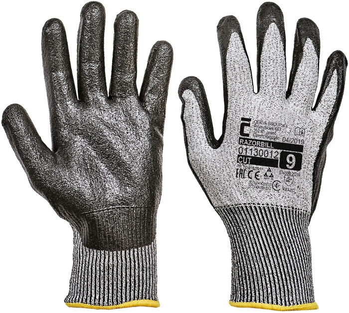 Pletené bezešvé rukavice z modifikovaného skleněného vlákna, Spandexu a nylonu, s nánosem HCT nitrilu v dlani a na prstech a odolností proti prořezu tř. C.
