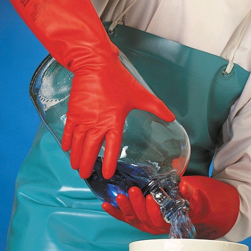 Červené rukavice z 0,425 mm silného nitrilu, s velurovou úpravou uvnitř, reliéfním povrchem v dlani a na prstech, v celkové délce 38 cm, individuálně testovány na těsnost.