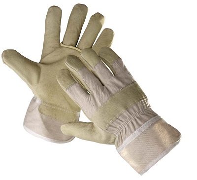 Rukavice z vepřové štípenky v dlani, bílé bavlněné tkaniny na hřbetu a manžetě a s teplou podšívkou.