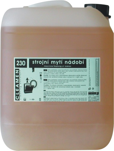 Tekutý, bezfosfátový, vysoce koncentrovaný, mycí prostředek, určený pro všechny typy profesionálních myček nádobí a skla s automatickým dávkováním. Oproti běžným prostředkům umožňuje dosažení vyššího mycího účinku při nízkém dávkování a vhodném nastavení podle místních podmínek. Prostředek je velmi vhodný i na mytí nápojového skla. Při slabém znečištění je možno využít velmi nízké dávkování 0,5 – 1g/litr pracovního roztoku. Použití: Pro strojní mytí s automatickým dávkováním nastavte dávkovací čerpadlo dle naměřené tvrdosti vody, dle provozních podmínek a míry znečištění nádobí v rozmezí 0,5 – 3 g/litr pracovního roztoku. K přesnému seřízení dávkování použijte titrační soupravu ( Titrační kufřík Cleamen ). Při ručním dávkování a běžném znečištění je obvyklá dávka 1,5ml/litr pracovního roztoku pH koncentrátu: 14 Seznam nebezpečných látek a zásady bezpečnosti práce jsou součástí Bezpečnostního listu. Není vhodné na nádobí z barevných kovů a hliníku. Výrobek se používá vždy v kombinaci s Cleamenem 231 strojní oplach nádobí.