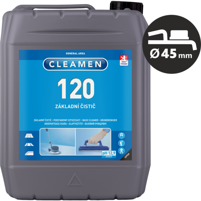 Prostředek, určený pro odstranění i opravy všech typů starých disperzí a vosků z PVC a linolea. Lze jej používat i jako základní čistič, hlavně před pokládáním vosků, účinně působí na zašlapanou špínu na všech podlahových krytinách odolných alkáliím (dlažby, PVC, starší linoleum, teraso, cihelné povrchy, nelesklá žula). Odstraňování disperzí: Naředěný roztok (viz. tabulka) aplikujte na povrch buď z nádrže podlahového kotoučového stroje nebo ručně mopem. Okraje očistěte ručním podlahovým padem. Strojem s modrým padem při standardní rychlosti odstraňte staré vrstvy vosku a odsajte vysavačem na mokré sání. Povrch poté zneutralizujte vodou. Před aplikací vosku nechte dobře vyschnout. Oprava disperzí: Naředěný roztok (cca 1:100) z tlakového rozprašovače aplikujte na odstraňované části tak, aby byl povrch vlhký a podlahovým kotoučovým strojem s vysokou rychlostí a modrým padem odstraňte horní ošlapanou vrstvu. Vymopujte čistou vodou celý povrch a nechte vyschnout. Na vyschlý povrch aplikujte rozprašovačem Cleamen 123 rozředěný v poměru 50 ml do 1 litru. Neaplikujte na více než 5 m2 a okamžitě přeleštěte podlahovým kotoučovým strojem s vysokými otáčkami a bílým padem. Základní čištění: Prostředek nařeďte podle míry znečištění (viz. tabulka) a roztok aplikujte na povrch, u menších povrchů z rozprašovače, u větších povrchů buď strojně nebo mopem. Nechte působit, odsajte vysavačem na mokré sání, nebo setřete mopem a omyjte (neutralizujte) čistou vodou. Koncentrace 300ml/1L se používá na PVC, není vhodná (příliš silná) na odstraňování vosků z přírodních linoleí a marmoleí (např. marmolea zn. Forbo). pH koncentrátu: 13,5 Seznam nebezpečných látek a zásady bezpečnosti práce jsou součástí Bezpečnostního listu. Nepoužívat na vysoce lesklé povrchy a povrchy, které nejsou odolné alkáliím.