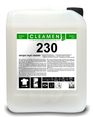 Tekutý, bezfosfátový, vysoce koncentrovaný, mycí prostředek, určený pro všechny typy profesionálních myček nádobí a skla s automatickým dávkováním. Oproti běžným prostředkům umožňuje dosažení vyššího mycího účinku při nízkém dávkování a vhodném nastavení podle místních podmínek. Prostředek je velmi vhodný i na mytí nápojového skla. Při slabém znečištění je možno využít velmi nízké dávkování 0,5 – 1g/litr pracovního roztoku. Použití: Pro strojní mytí s automatickým dávkováním nastavte dávkovací čerpadlo dle naměřené tvrdosti vody, dle provozních podmínek a míry znečištění nádobí v rozmezí 0,5 – 3 g/litr pracovního roztoku. K přesnému seřízení dávkování použijte titrační soupravu ( Titrační kufřík Cleamen ). Při ručním dávkování a běžném znečištění je obvyklá dávka 1,5ml/litr pracovního roztoku pH koncentrátu: 14 Seznam nebezpečných látek a zásady bezpečnosti práce jsou součástí Bezpečnostního listu. Není vhodné na nádobí z barevných kovů a hliníku. Výrobek se používá vždy v kombinaci s Cleamenem 231 strojní oplach nádobí.