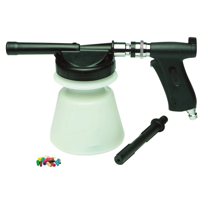 Průmyslové směšovací zařízení pro přímé dávkování čisticího roztoku ve formě řídké pěny, s pistolovou rukojetí a nádobkou na 1,4 l