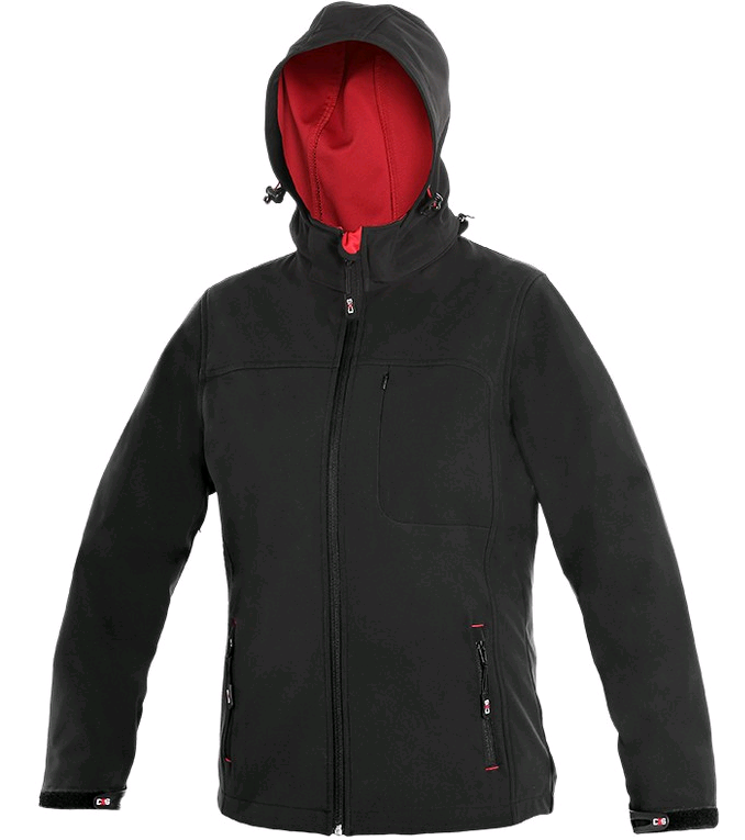 Dámská, softshell bunda, odolná proti vodě a větru, odnímatelná kapuce, rukávy zakončené regulovatelnou manžetou, TPU membrána, odolnost proti průniku vody 10 000 mm mimo oblast švů, paropropustnost 3 000 g/m2/24 hod.