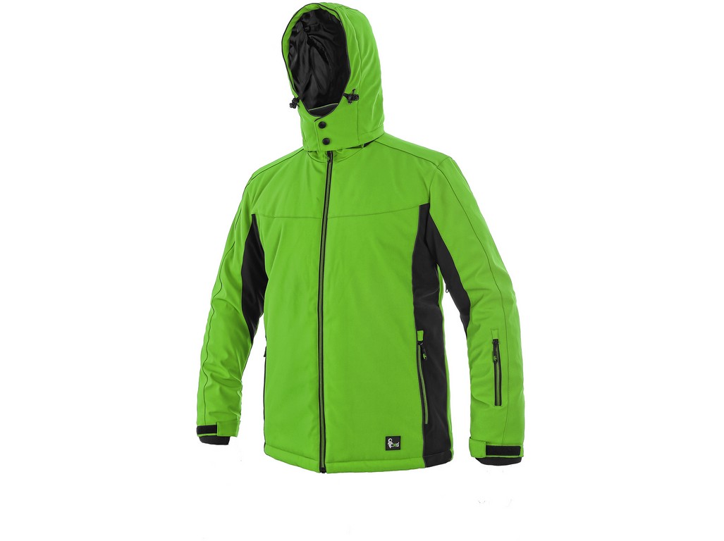 Pánská zateplená softshellová bunda, odolná proti vodě a větru, větrání v podpaží, odepínací kapuce, regulovatelná manžeta na rukávech a pružná manžeta v rukávech, stahování v dolním okraji, černé reflexní výpustky, TPU membrána, odolnost materiálu proti průniku vody 10 000 mm mimo oblast švů, paropropustnost 3 000 g/m2/24 h, podšívka je kombinací materiálů s fleecem, na levém spodním rukávu kapsička na zip, 2 spodní kapsy na zip, vnitřní kapsa.