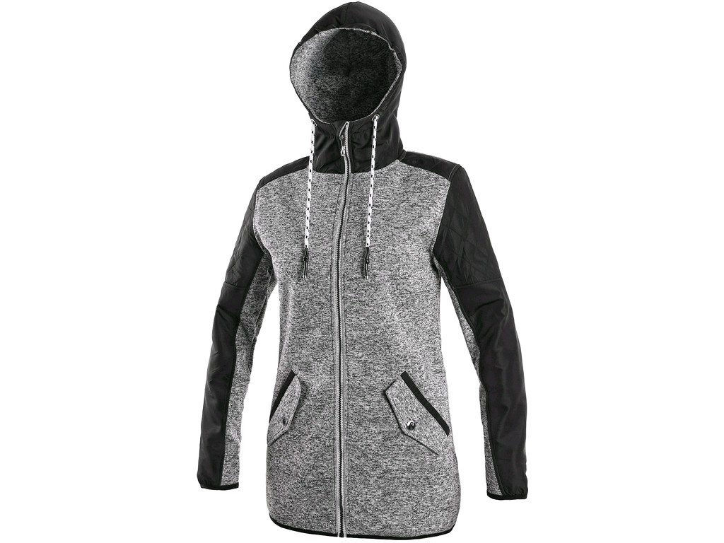 Dámská bunda z pleteniny, prodloužená, kombinace materiálů, kapuce napevno, zapínaní na zip, rukávy zakončeny gumičkou, 2 boční kapsy.