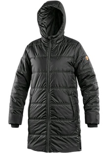 Dámský zateplený kabát s kapucí a bočním rozparkem na druky. Boční kapsy na zip, rukávy ukončeny pružnou manžetou, černé reflexní doplňky na kapuci, rozparku a podél hlavního zipu, vnitřní kapsa na zip.