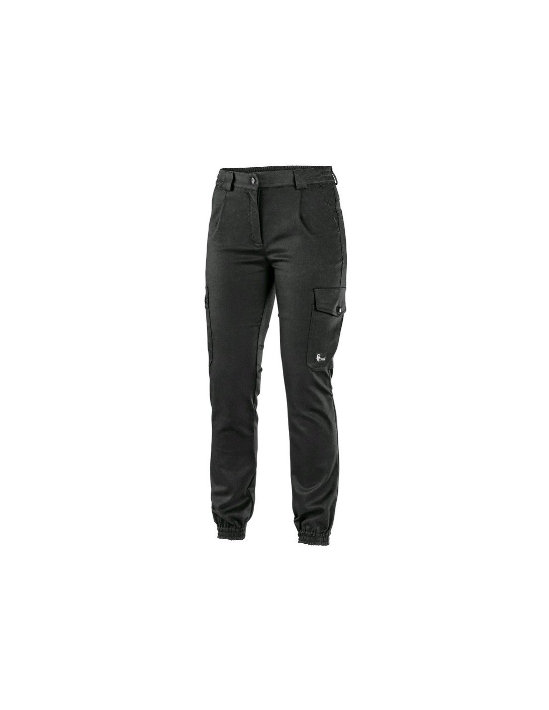 Dámské cargo kalhoty vyrobeny ze směsi bavlny a vlákna Sorona® firmy DuPont - vysoce odolného vůči skvrnám, vyznačujícího se vysokou pevností a tuhostí. Díky tomuto vláknu je materiál měkký, pružný a lze jej prát na teplotu 60 °C. Pas s poutky na opasek, vzadu do gumy, 2 přední a 2 zadní kapsy, boční nabírané kapsy - pravá na zip, levá krytá klopou s drukem, nohavice se zúženým gumovým lemem.