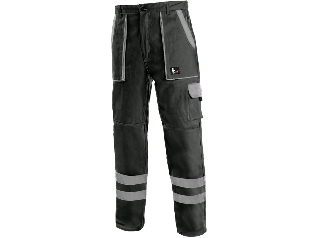 Pánské montérkové kalhoty, pas s poutky na opasek, vzadu do gumy, přední kapsy, boční kapsa na svinovací / skládací metr, boční kapsa na mobil / peněženku, zdvojená kolena, zadní kapsa s klopou, reflexní pruhy.