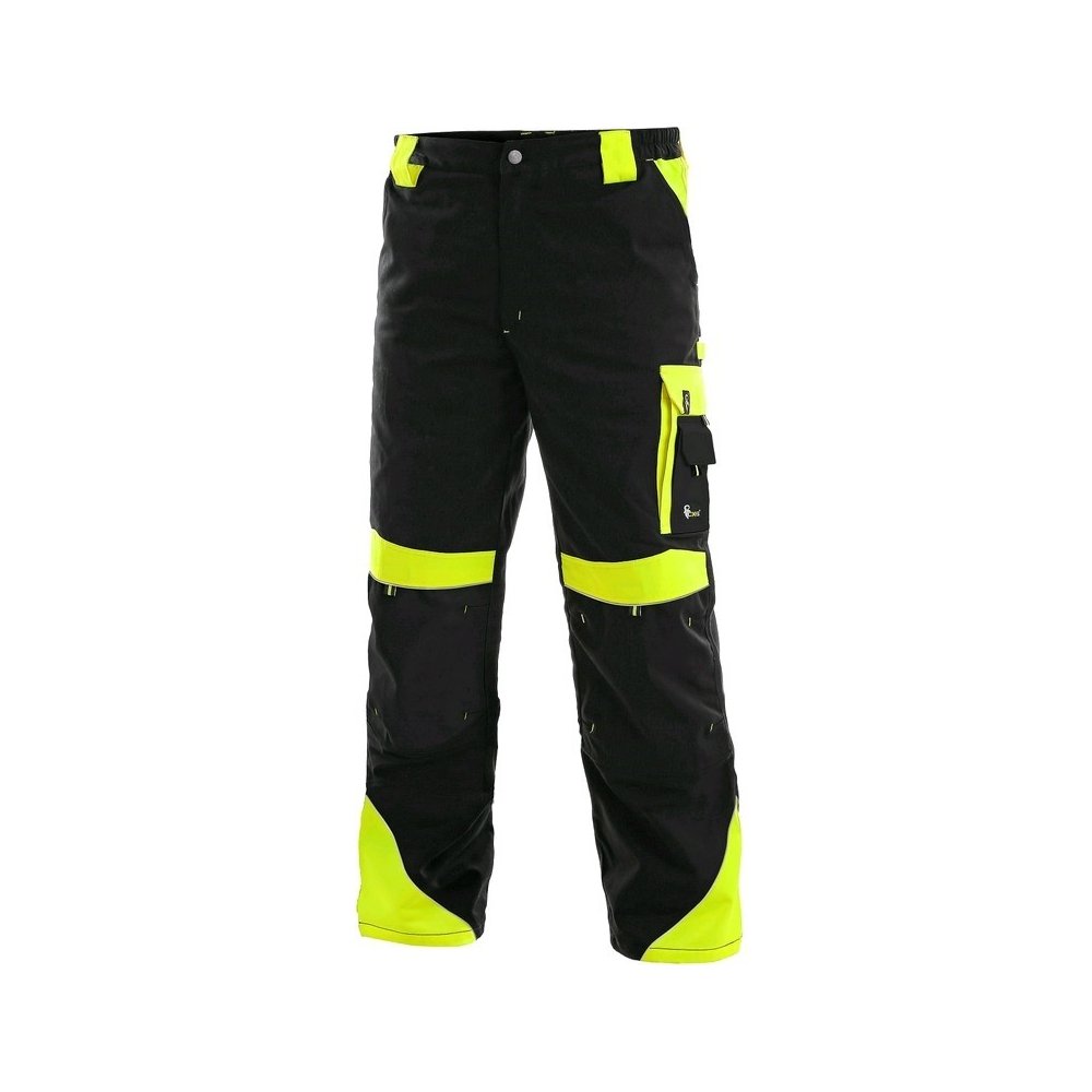 Pánské montérkové kalhoty zateplené flanelem, pas s poutky na opasek a gumou v bocích, přední klínové kapsy, multifunkční kapsy na obou stranách, kolena zesílena materiálem 600D polyesterem s možností vložení kolenních výztuh, dvě zadní kapsy s klopami, reflexní doplňky.
