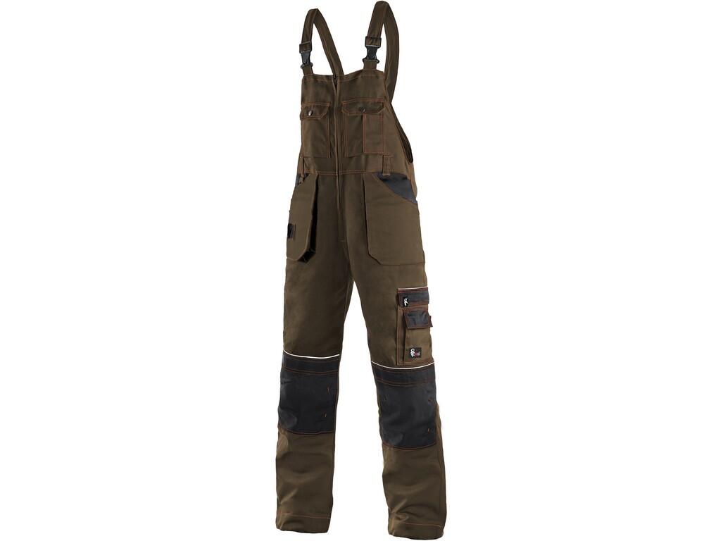 Pánské kalhoty s náprsenkou, náprsní kapsy s klopami, pas s poutky na opasek, vzadu do gumy, přední kapsy s poutky na nářadí, multifunkční kapsy na obou stranách, kolena zesílena 600D polyesterem s možností vložení kolenních výztuh, dvě zadní kapsy, jedna na suché zipy, šle s gumou vzadu, reflexní doplňky.