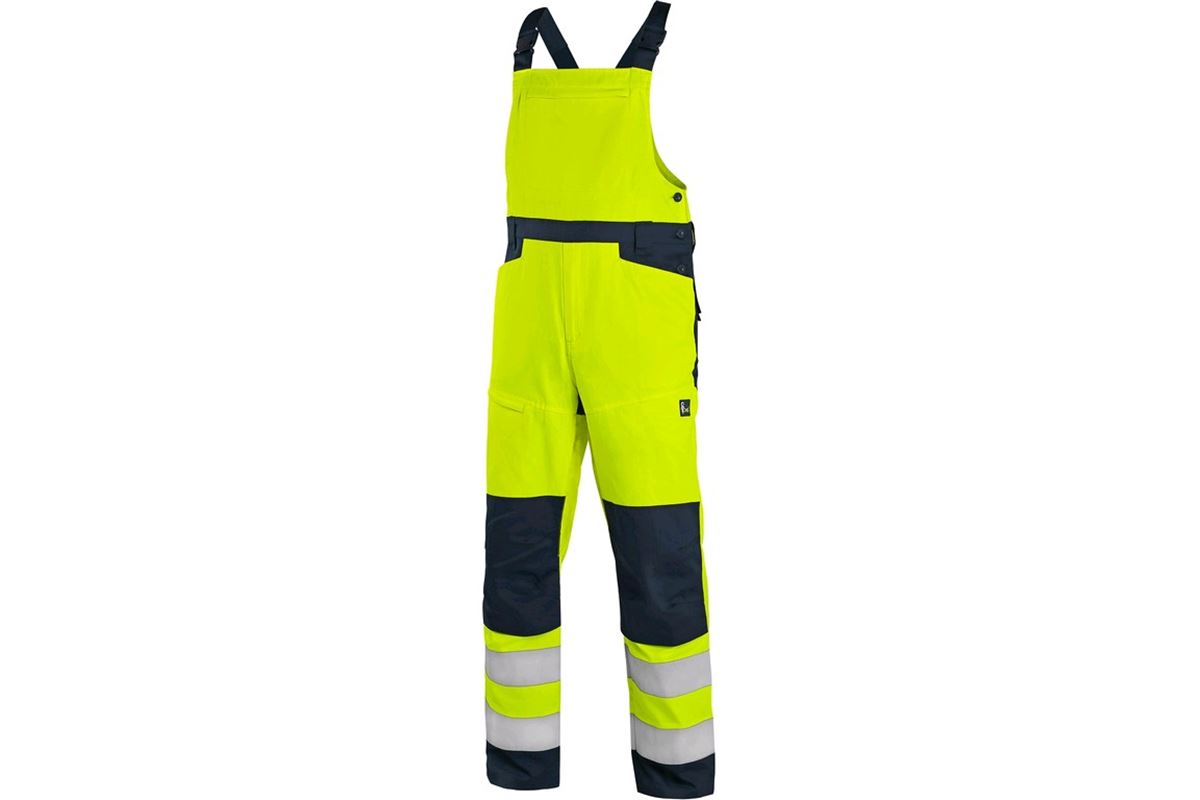 Pánské výstražné kalhoty s náprsenkou, letní, šle s gumou vzadu, náprsní kapsa na zip, boční zapínání na knoflíky, kryté přední zapínání na zip, 2 přední kapsy, 2 zadní kapsy s klopou na suchý zip, pravá boční kapsa na zip, zdvojená kolena s možností vložení kolenních výztuh, v zadní kolenní části mesh materiál zajišťující lepší odvětrávání, reflexní pásky (šíře 7 cm). V kombinaci s blůzou Halifax splňují ochrannou kategorii 3 (norma EN ISO 20471)