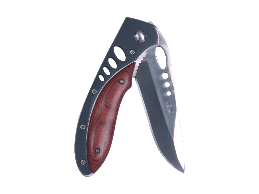 Čepel vyrobena z kvalitní oceli 440 s bezpečnostní pojistkou, dřevěná střenka.