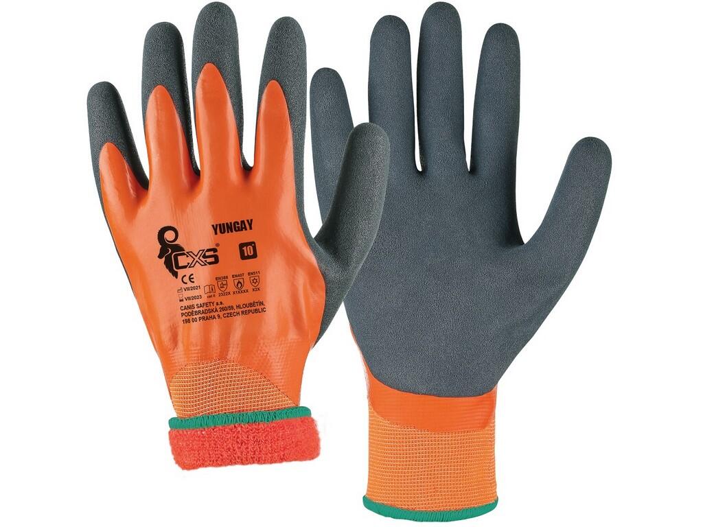 Zimní bezešvé rukavice z polyesterového úpletu s elastanem, povrstveny dvojitým latexem s pískovou úpravou v dlani pro lepší úchop, podšívka z česaného akrylového úpletu, pružná manžeta, ochrana proti kontaktnímu teplu do 100 °C.