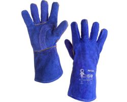 Rukavice zimní z modré štípené hověziny s bavlněnou vložkou, vel. 11", kryté švy žlutou kůží délka 35 cm, zesílená dlaňová část, certifikované na svářecí práce