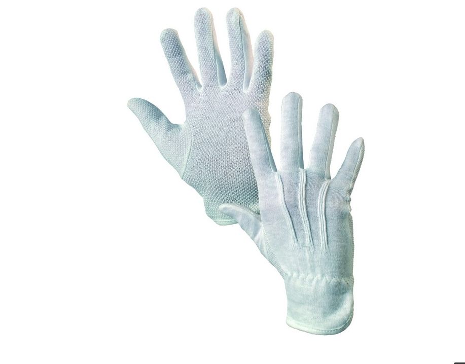 Textilní rukavice, dlaň a prsty pokryty drobnými PVC terčíky, gumička v zápěstí. Doporučené použití: manipulace s lehkými, nebo drobnými předměty. Odvětví: logistika a skladování.